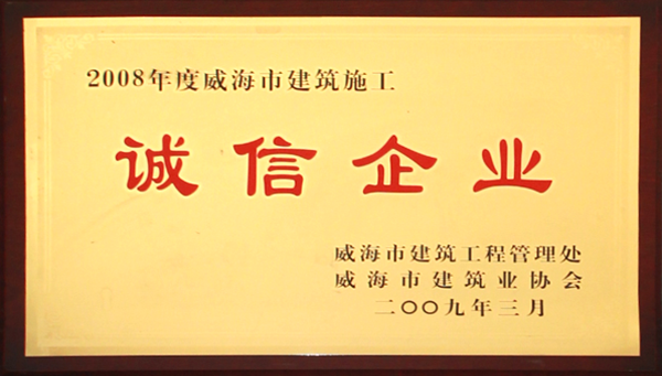 公司連續八年榮獲威海市“誠信開發企業”、“建筑施工誠信企業”,連續九年被評為威海市級“守合同重信用企業”,多次被評為威海市“市級文明單位”、“質量管理先進企業”、 “安全管理先進企業”,乳山市“優秀企業”、“先進民營企業”、“納稅明星企業”,在社會上逐步樹立了誠信、穩健的企業形象。